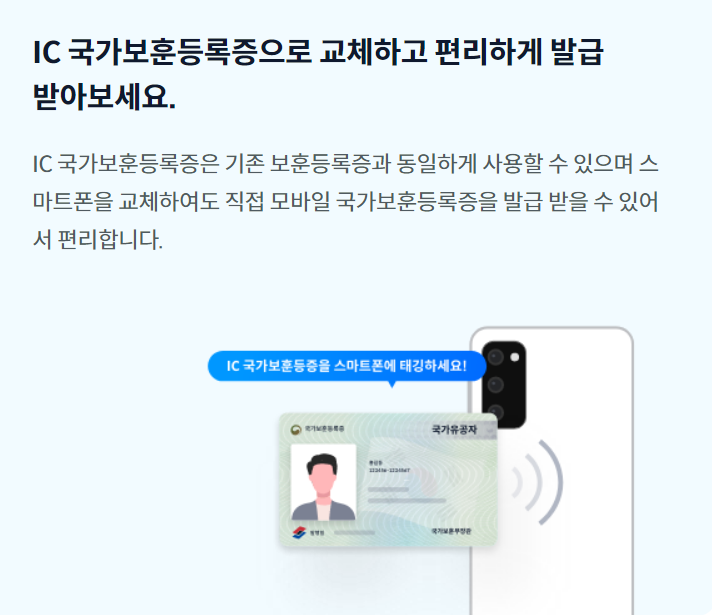 IC 국가보훈등록증도 기존에 가지고 있던 국가보훈등록증과 동일하게 사용할 수 있고, 스마트 폰을 교체하여도 직접 모바일 국가보훈등록증을 발급 받을 수 있어서 편리합니다.