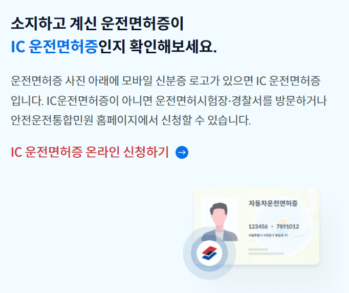 소지하고 있는 운전면허증이 IC운전면허증인지 아닌지 확인을 해보세요. 운전 면허증 사진 아래에 모바일 신분증의 로고가 있으면 IC 운전면허증이니 그대로 진행하시면 되고 IC 운전면허증이 아니라면 발급 받아야 이용할 수 있습니다.