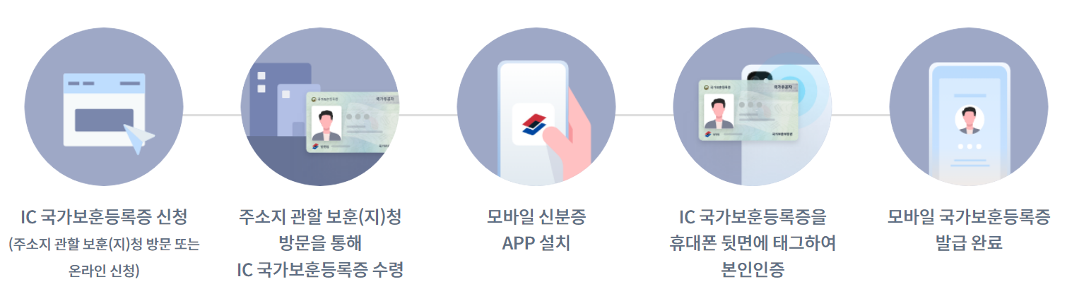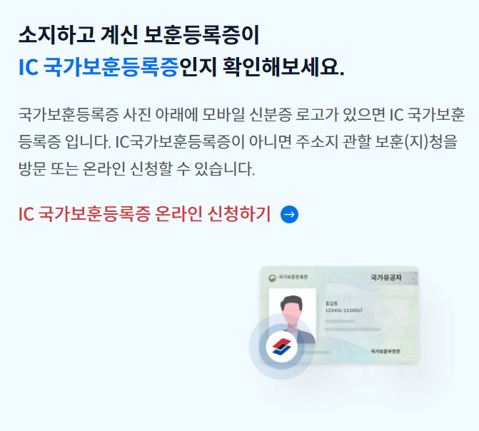 운전허증과 마찬가지로 국가보훈등록증 사진 아래에 모바일 신분증 로고가 있으면 IC 국가보훈등록증입니다. IC 국가보훈등록증이 아니라면 주소지 관할 보훈청을 방문하거나 온라인에서도 신청할 수 있습니다.