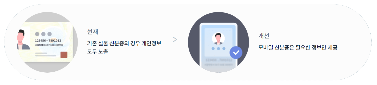 기존의 실물 신분증의 경우에는 개인 정보가 모두 노출되는 반면에 개선된 모바일 신분증으로는 필요한 정보만을 제공할 수 있는데 선택적인 정보만 제출함으로써 내 정보를 보호 할 수 있습니다.